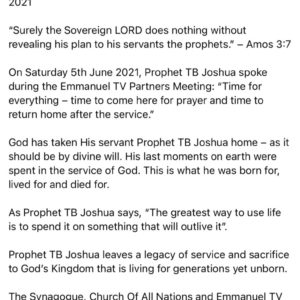 Following the reported death of the founder of the Synagogue Church of All Nations (SCOAN) Temitope Joshua popularly known as Prophet TB Joshua,the church in a statement on Sunday morning finally confirmed his demise.