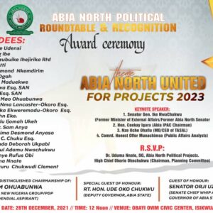 The event will also feature Awards and recognitions to few illustrious Nigerians that have distinguished themselves in service to the people of Abia North, Abia State, Nigeria and humanity including Minister of State for Mines and Steel Development, Uchechukwu Sampson Ogah, Prof. Greg Ibe, Sir Chikwe Udensi, Dr. Alex Otti, Chief Raymond Nkemdirim, Lt. Gen. Azubuike Ihejirika CFR, Dr. Chidia Maduekwe, Barr. Etigwe Uwa SAN, Barr. Ken Ahia SAN, Senator Mao Ohuabunwa, Nnenna Nma Lancaster-Okoro, Nwanneka Ekweremadu-Okoro, Chief Kalu Ijomah, Chief Chima Desmond Anyaso, Chief Dr. Sam Anya, Barr. Chijioke Chuku, Lady Lynda Deborah Ukpabi, Capt. Paul Nwachukwu, Engr. John Eke, Dr. Uduma Nnate, Chief Uguru Chukwudi Clement and Dr. Onyinye Rufus Obi.