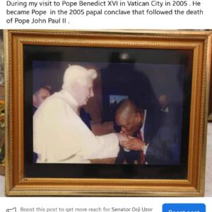 A classical photograph of prominent Nigerian leader , Chief Whip of the Senate, Senator Orji Uzor Kalu and world recognised cleric,retired prelate of the Catholic church, Pope Benedict XVI has emerged online.
